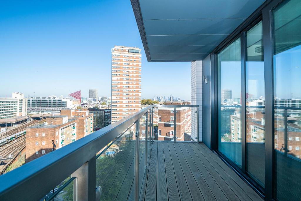 A bright and beautiful apartment. A large king sized master bedroom and 2 other bedrooms, 1 with a single bed and another room that can be a double or 2 singles. 2 large bathrooms including an ensuite off the master bedroom. Modern open plan living space and a stunning view off a balcony. Close to shopping centre with restaurants, cinema and shops, easy reach of underground station and bus routes. This modern 3 bedroom apartment is set in a brand new building near Victoria. The living area has a sleek, comfortable couch, modern dining table and a wide smart TV. There are three well sized bedrooms, the master bedroom with a king bed an ensuite. There is good storage for guests in every room. The main bathroom has a rainfall shower and bath. The kitchen holds all amenities needed for a stay in London and there is a seperate a washing machine/tumble dryer.