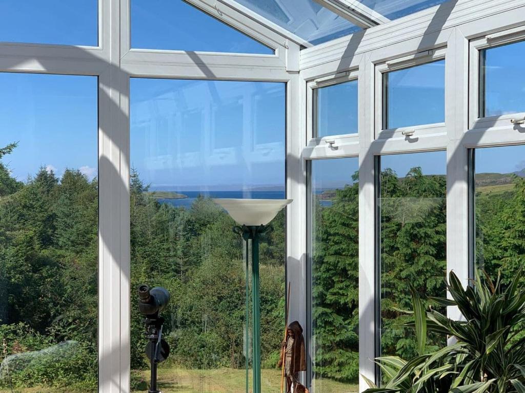 Fasgadh offers the perfect family retreat, comfortably accommodating up to 6 guests in beautiful surroundings. . Ground Floor: All on the ground floor. Living room: With 65" Freeview Smart TV, DVD player, Blu-ray player, music system with iPod dock, Amazon Echo and wooden floor, leading to... Conservatory/dining room: With wood burner. Kitchen: With electric oven, electric hob, microwave, fridge/freezer, dishwasher, coffee machine, washing machine and wooden floor. Bedroom 1: With double bed and wooden floor. Bedroom 2: With twin beds and wooden floor. Bedroom 3: With twin beds and wooden floor. Bathroom: With bath, shower cubicle and toilet.. Oil central heating, electricity, bed linen, towels and Wi-Fi included. Initial logs for wood burner incuded. Welcome pack. . Patio with garden furniture. Private parking for 3 cars. No smoking. . Fasgadh is set in a peaceful, rural location with beautiful views across the surrounding hills and out to sea across Loch Snizort, with the Outer Hebrides on the horizon. Fasgadh is a detached cottage full of vibrancy and has been lovingly furnished throughout. A key feature of Fasgadh is its large conservatory offering delightful views a...
