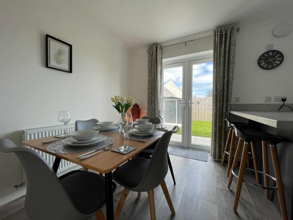 Excellent standard of accommodation close to the centre of amazing Dornoch. Perfect staycation destination for the family.. Ground Floor: Open plan living space. Living area: With Freeview Smart TV. Dining area: With patio doors leading to garden. Kitchen area: With breakfast bar, electric oven, electric hob, microwave, fridge/freezer, dishwasher and washing machine.. First Floor: Bedroom 1: With kingsize bed and en-suite with shower cubicle, toilet and heated towel rail. Bedroom 2: With twin beds. Bathroom: With shower over bath, toilet and heated towel rail.. Electric central heating, electricity, bed linen, towels and Wi-Fi included. Travel cot, highchair and stairgate. Welcome pack.. Enclosed lawned garden with patio and garden furniture. Private parking for 2 cars. No smoking.. This house is perfect for a small family or a couple wanting a brilliant Highland holiday base for a week or short break. On the edge of fabulous Dornoch, where you’ll find a little cathedral, history round every corner, lots of lovely little independent shops, cafés and restaurants, as well as a world-class royal Dornoch golf course, and the huge sandy beach waiting to be wande...