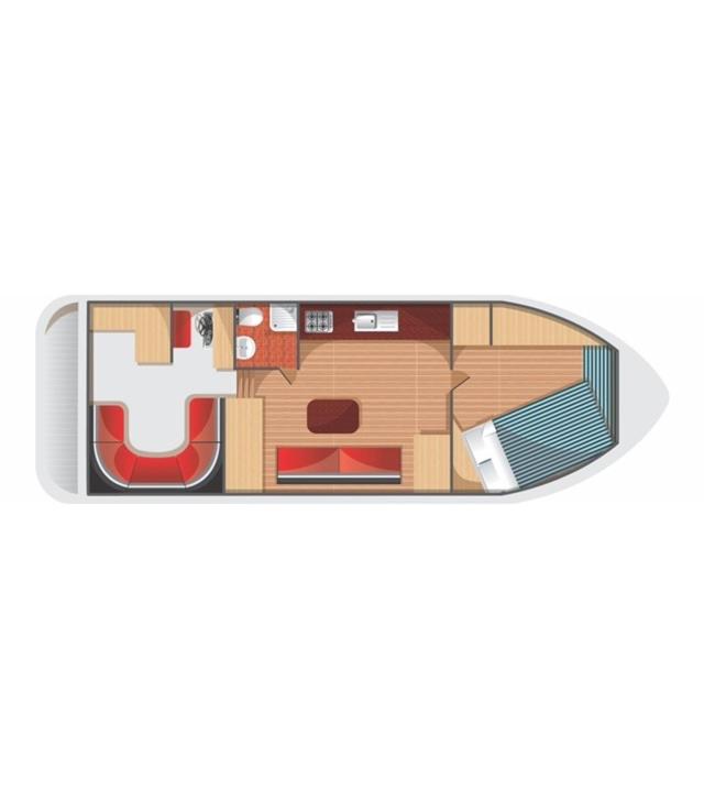 The air-conditioned boat consists of 1 bedroom, a kitchen with dining area, and 1 bathroom with shower.