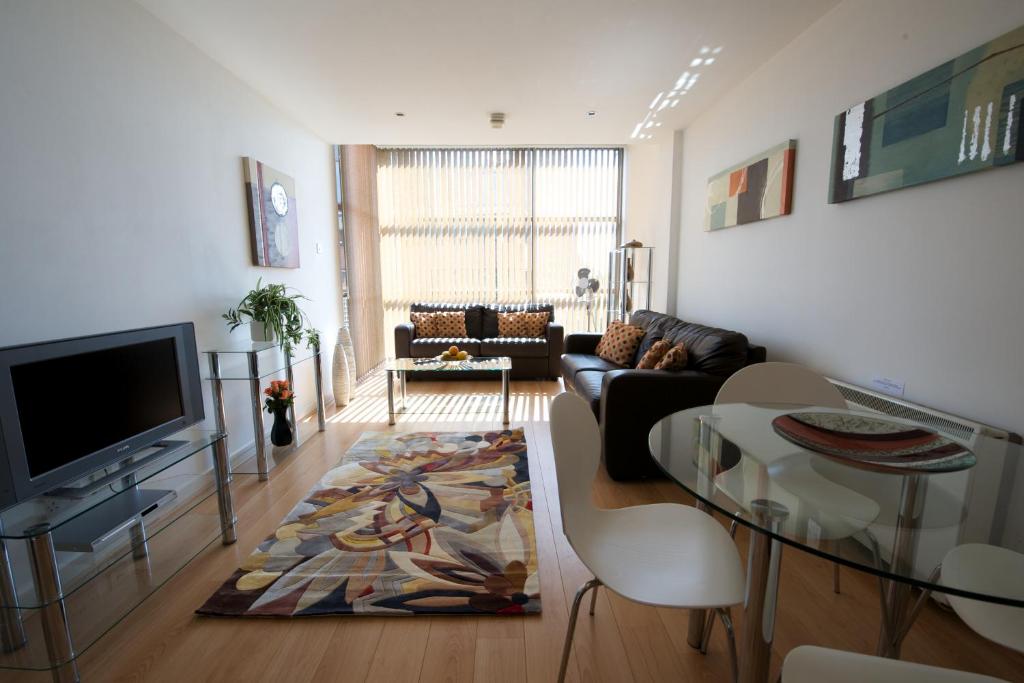 Independently rated 4 stars by Visit England, Stay Deansgate Apartments for 14 nights plus is set in the Manchester City Centre district of Manchester, 400 metres from Manchester Central. Complimentary WiFi is available. All units comprise a seating area with full height windows and a 40 inch Smart TV, a dining area, and a fully equipped kitchen with various cooking facilities, including a washer/dryer dishwasher, an oven and a microwave. A balcony with city views is offered in all units. The Metrolink, rail stations and free city centre bus, are all within walking distance from the property. The nearest airport is Manchester Airport, 12 km from Stay Deansgate Apartments for 14 nights plus.
