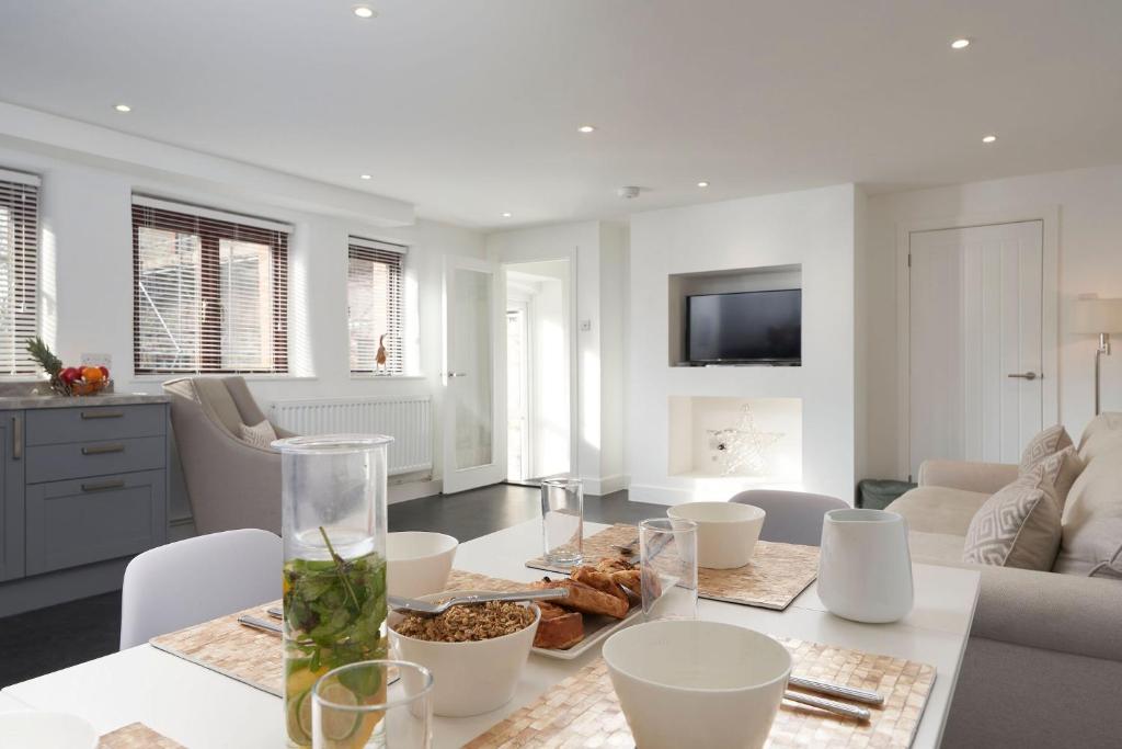 The accommodation has a flat-screen smart TV, living room and dining area. There is a full kitchen with oven, dishwasher and a refrigerator. The bathroom features a shower.