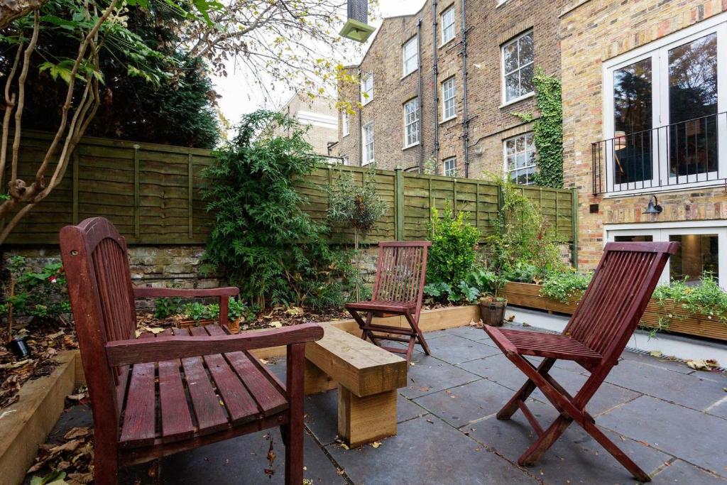 LIVING ROOM AND STUDY To the right as you enter the property at street level is the living space. With high ceilings, there are two red sofas, a fireplace and a television. This living space extends towards the back of the house leading to a teal coloured study area. There is a WC just off the study for added convenience. KITCHEN This modern white fitted kitchen features an induction hob, oven, dishwasher and plenty of surface space. There is a large glass dining table seating 8 guests. MASTER BEDROOM WITH EN SUITE The master bedroom is fitted with a four-poster king sized bed and a large wardrobe. This bedroom has access to an en suite fitted with a combined bath and shower and single wash basin. The master en suite includes a shower, WC and basin- all in sleek tiling. SECOND BEDROOM The second bedroom is fitted with a double bed and is embellished with a chandelier and decorative art. THIRD BEDROOM WITH EN SUITE Located on the top floor this bedroom is fitted with a king-sized bed and fitted wardrobe as well as access to an en suite bathroom. The en suite bathroom features a spacious walk-in shower, single wash basin, and WC. FOURTH BEDROOM This fourth bedroom features a double bed and mirrored fitted wardrobes. BATHROOM This bathroom on the top floor is fitted with a large walk-in shower and single wash basin. OUTDOOR SPACE This property has a private patio and garden area with outdoor seating, perfect for the summer months!